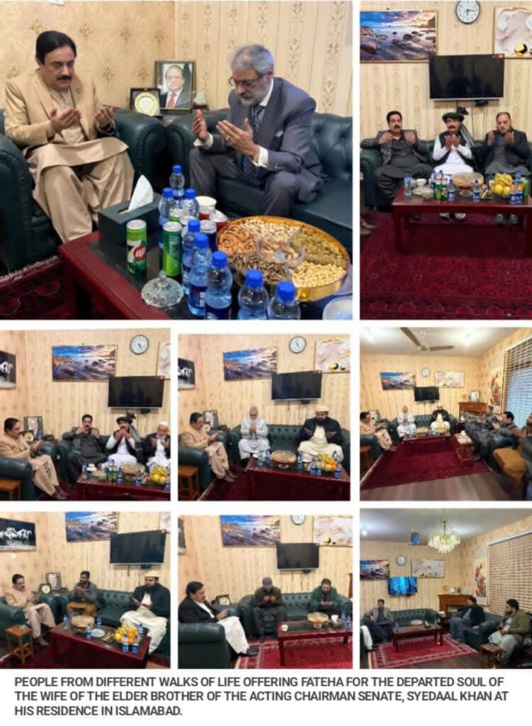 A delegation comprising tribal elders, prominent traders, business leaders, and renowned social figures called on Acting Chairman Senate Syedul Khan Nasir at the Parliament House, Islamabad, to offer heartfelt condolences on the demise of his sister-in-law.The condolence delegation included Mirza Mansoor Baig (Pakistan Muslim League–N, Islamabad), Naeem Sahib, Sheikh Arsalan, Hashim Nasir, Pir Muhammad Khan Kakar, Umar Chauhan, Hayatullah Kakar, along with other respected tribal elders, traders, and social personalities from various communities. The members of the delegation expressed deep sorrow and grief over the loss and conveyed their sincere sympathies to the bereaved family.During the meeting, Fateha was offered for the departed soul, and prayers were made for the eternal peace of the deceased, elevation of her ranks in the hereafter, and patience and strength for the grieving family.The delegation affirmed their solidarity with the bereaved family, stating that they stand by them in this moment of grief and share their sorrow during this difficult time.Acting Chairman Senate Syedul Khan Nasir thanked the delegation for their visit and expressed gratitude for their compassion and support. He remarked that the prayers, affection, and solidarity of the people are the greatest source of comfort in times of loss.