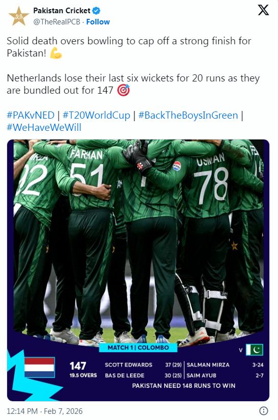 Chasing 148, Pakistan reached 147 for seven in 19.3 overs, surviving a nervy finish after sustained pressure from the Netherlands during the middle phase of the chase.