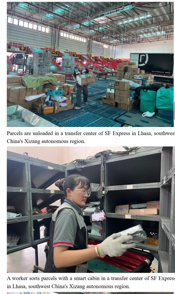 At around 9 a.m., a delivery truck pulled into SF Express’s logistics park on the outskirts of Lhasa, southwest China’s Xizang autonomous region. Workers swiftly unloaded parcels onto conveyor belts, sorting them into destination-specific containers.