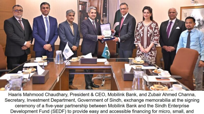 March 03, 2026: Pakistan’s leading digital microfinance bank, Mobilink Bank, has entered into a five-year partnership with Sindh Enterprise Development Fund (SEDF), Government of Sindh, to expand access to structured financing for micro, small, and medium enterprises (MSMEs) across priority economic sectors in the province. The collaboration will unlock up to PKR 1 billion in financing by combining Mobilink Bank’s lending capabilities with SEDF’s markup subsidy support to reduce the cost of capital for entrepreneurs and stimulate sustainable economic activity province-wide.The collaboration strengthens financing ecosystems for underserved and high-impact sectors, including agri value chains, livestock and dairy, poultry, fisheries, cold storage and logistics, renewable and alternative energy solutions, women-led enterprises, mining and mineral processing, and innovation-driven IT projects. Under the partnership, Mobilink Bank will extend short, medium, and long-term MSME financing, while SEDF will provide markup subsidy support of up to one-year KIBOR or 10 percent – whichever is lower – for an initial three-year period, extendable based on performance. Individual projects will be eligible for financing of up to PKR 5 million, with flexibility for expansion in innovative cases.Commenting on the partnership, Haaris Mahmood Chaudhary, President & CEO, Mobilink Bank, said, “Small businesses are the backbone of Pakistan’s real economy. They drive employment, power local communities, and sustain regional value chains, yet many entrepreneurs continue to face structural barriers in accessing affordable finance. Through our partnership with SEDF, we are aligning financial innovation with policy support to expand access where it is needed most. We want to channel affordable capital directly to local entrepreneurs, enable bottom-up economic growth, and unlock sustainable livelihoods across the province. This collaboration is about strengthening small businesses today to build a more resilient and inclusive economy for tomorrow.”Zubair Ahmed Channa, Secretary, Investment Department, Government of Sindh, underscored the Government’s commitment to strengthening institutional financing ecosystems that support productive sectors across the province. He stated that structured collaborations such as this agreement reinforce policy alignment between the public and private sectors while creating scalable financial pathways for SMEs operating in Sindh’s value-added industries.The partnership reflects Mobilink Bank’s commitment to combine public policy support with private sector efficiency to drive inclusive growth, sustainability, and entrepreneurship in Pakistan’s emerging economic regions. The collaboration will enable MSMEs, particularly those in rural areas and women-led businesses, to invest in productivity, adopt green technologies, and scale their operations at lower borrowing costs and improved access to formal credit.The Mobilink Bank-SEDF partnership will integrate concessional support with commercial financing to spur long-term economic resilience in Sindh, a viable model that can be well replicated in other provinces.Best Regards.