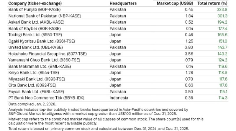 Islamabad, January 8: Smaller Pakistani banks delivered some of the highest total returns to investors across the Asia-Pacific region in 2025, buoyed by a strong rally in local equity markets and improving macroeconomic indicators, according to an analysis by S&P Global Market Intelligence.The Bank of Punjab emerged as one of the top-performing banks in the region, posting total returns of 333.8% in 2025. This placed it among Asia-Pacific banks with a market capitalisation exceeding $100 million tracked by S&P Global.The National Bank of Pakistan (NBP) ranked second, generating 301.3% total returns for investors during the year. Askari Bank Ltd. and The Bank of Khyber followed, recording gains of 194.2% and 177.4%, respectively.Other Pakistani lenders also posted strong gains during the year. United Bank Limited (UBL), with a market capitalisation of $3.8 billion, recorded investor returns of 143%. Bank Makramah, with a market capitalisation of around $140 million, delivered 119% returns, while Faysal Bank, valued at approximately $500 million, generated 115% total returns in 2025.Overall, Pakistani banks accounted for six of the top 10 return-generating banks in the Asia-Pacific region covered in the S&P Global analysis.The strong performance mirrored broader gains in Pakistan’s equity market. The benchmark KSE-100 index advanced for a third consecutive year, rising 51.2% in 2025 to close at a record high. Market momentum was supported by improved economic indicators, fiscal consolidation and relative political stability.According to the International Monetary Fund, Pakistan’s economy expanded by 10.5% in 2025, marginally higher than the 10.4% growth recorded a year earlier. Inflation eased sharply to 3.2%, down from 12.6% in 2024, improving investor sentiment and lending conditions.S&P Global noted that more than half of the top 10 gainers in its analysis had market capitalisations below $1 billion, underscoring the outsized returns delivered by smaller lenders amid improving domestic fundamentals.The findings place Pakistani banks alongside select Japanese lenders as standout performers in the Asia-Pacific banking sector during 2025.Here is the link to complete report. https://www.spglobal.com/market-intelligence/en/news-insights/articles/2026/1/smaller-pakistani-japanese-banks-deliver-highest-total-returns-in-2025-96721929-ENDS-
