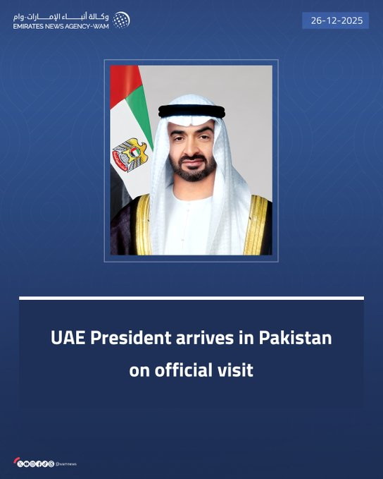 According to WAM, President Al Nahyan was received by Prime Minister Shehbaz Sharif at the Nur Khan airbase.