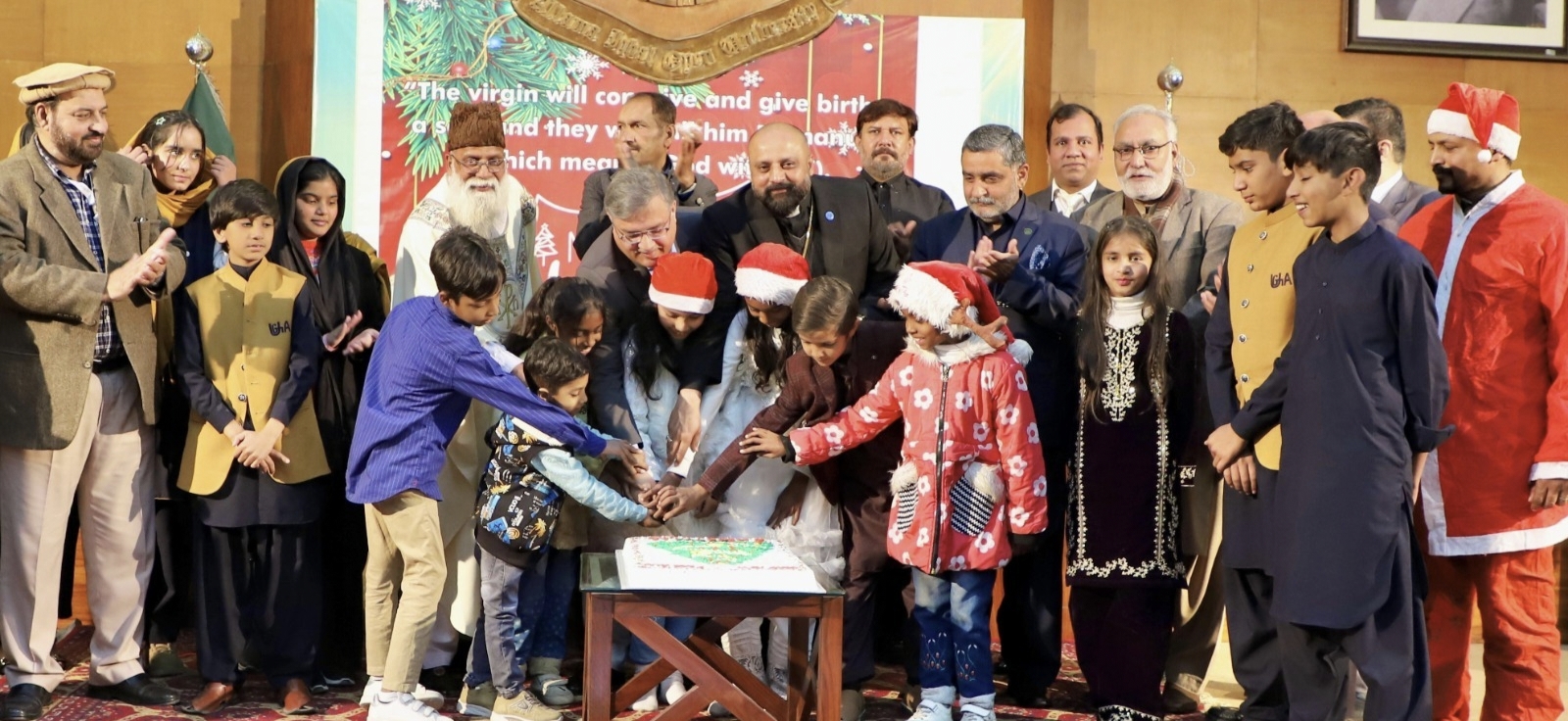 The event was also attended by the university’s Registrar, Raja Umar Younas, faculty members, and principal officers. At the conclusion of the ceremony, Vice Chancellor Professor Dr. Nasir Mahmood shared Christmas cake with the participants and children.